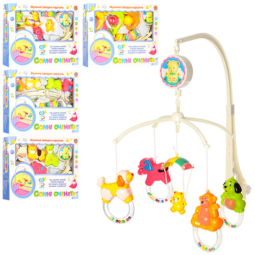 Карусель D089-90-1-2-3 (36шт) на ліжечко,заводна,муз,підвіски 4шт, плюш, 5видів,в кор-ці,40-30-5cм (шт.)