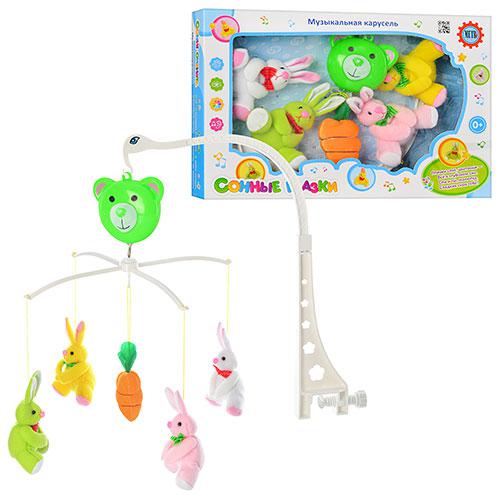 Карусель 699-16 (48шт) на ліжечко, заводна, підвіски плюш 5шт, муз, в кор-ку, 40-26,5-5см (шт.)