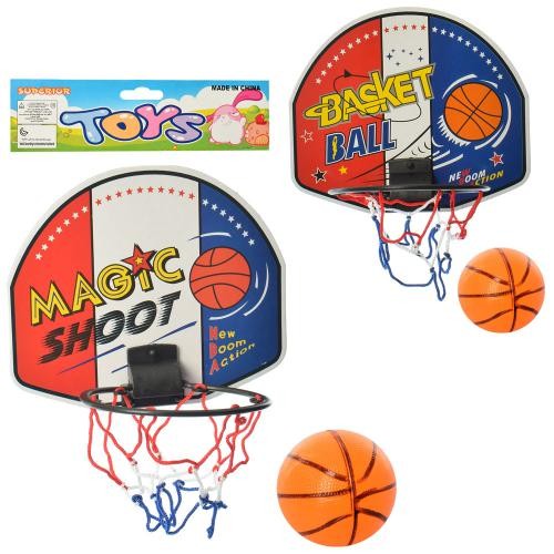 Разместить в 1 или 2 колонкиБаскетбольне кільце M 5716 (120шт) щит21см, сітка, м'яч7,5см, 2 види, в кульку, 22-25-8см (шт.)
