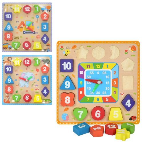 Дерев'яна іграшка Годинник MD 1903 (50шт) рамка-вкладиш, 3 види, у кульку 18-18-2см (шт.)