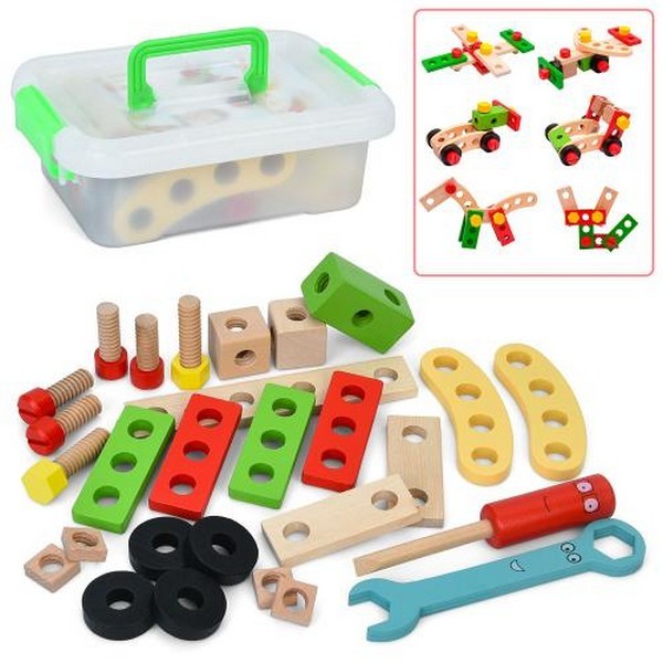 Дерев'яна іграшка Конструктор 01-105 (10шт) літак, молоток, блоки, 57дет, кор, 29,5-23,5-6,5см (шт.)