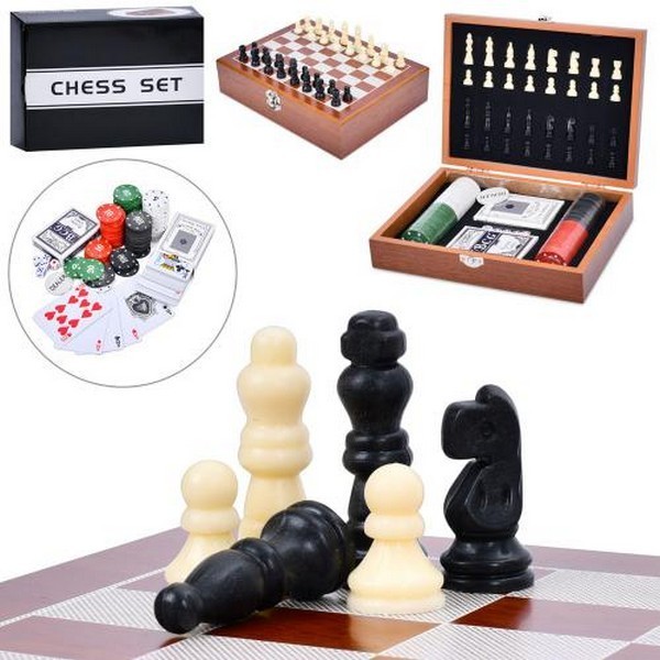 Шахи TD202309 (15шт) дерев'яні, фігури пластик, 2в1 (покер, 2 колоди карт,фішки з номіналом), в кор- (шт.)