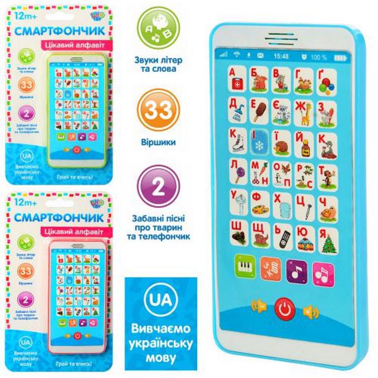 Телефон M 3674 (72шт)Абетка,навч,абетка,вірші,муз-звук(укр),рег. гучн, мікс кол, бат, на листі,13-23 (шт.)
