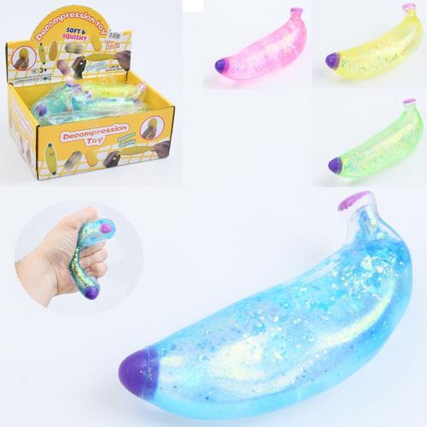 Іграшка MS 4034 (144шт) антистрес, банан, 12см, глітер, тягнеться, 4кольори, в пакеті, 12шт в диспле (шт.)