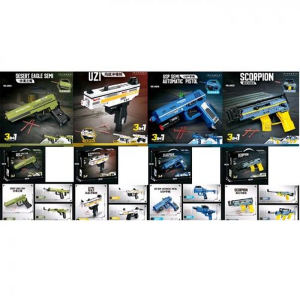 Конструктор E46024-25-26-27 (36шт) пістолет, від 225 до 312 деталей, 4 види, 3в1, в кор-ці, 38-28-6, (шт.)