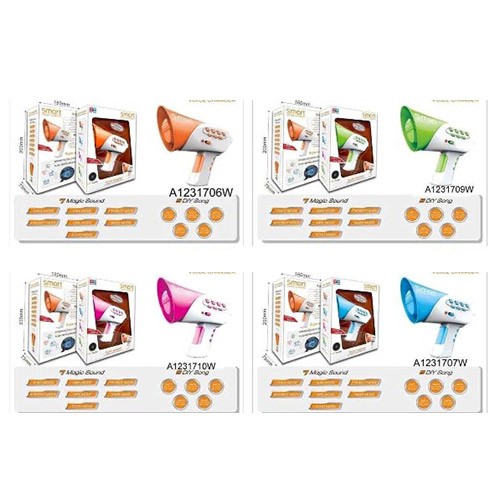 Разместить в 1 или 2 колонкиМегафон R-801-2-3-4 (30шт) 13см, зміна голосу, 4 кольори, на бат-ці, в кор-ці, 16-20-7,5см (шт.)