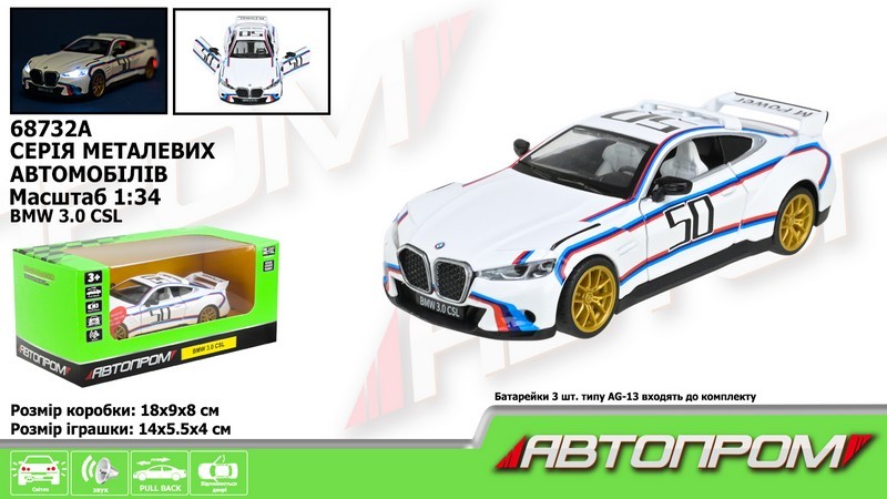 Машина мет. АВТОПРОМ арт. 68732A (48шт/2) 1:34 "BMW 3.0 CSL", батар, світ., звук, відкр.двері, короб (шт.)