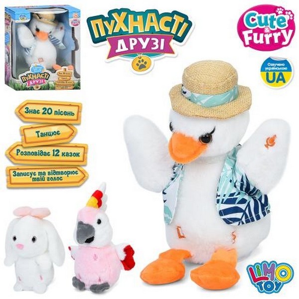Тварина M 6163 I UA (24шт) 21см, 20пісень, запис, 12 казок, рухлива, плюш, 3 види(папуга, гусак, зай (шт.)