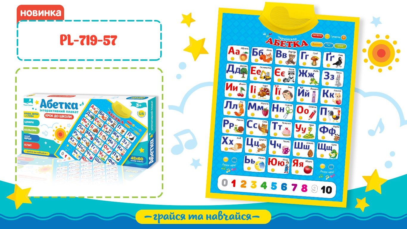 Плакат 7031 UA-CP (26шт) 41-55см,навч,звук(укр),бук/циф,вірші,загад, муз(укр),на бат,в кор,45-21-4см (шт.)