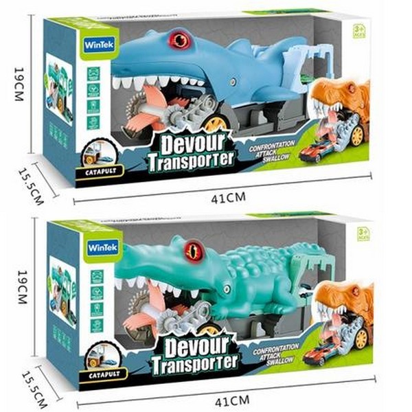 Разместить в 1 или 2 колонкиТрейлер-монстр-трек E7016/7017 акула/крокодил з метал.машинками(2шт.) батар.муз.світ.кор.41*15,5*19 (шт.)